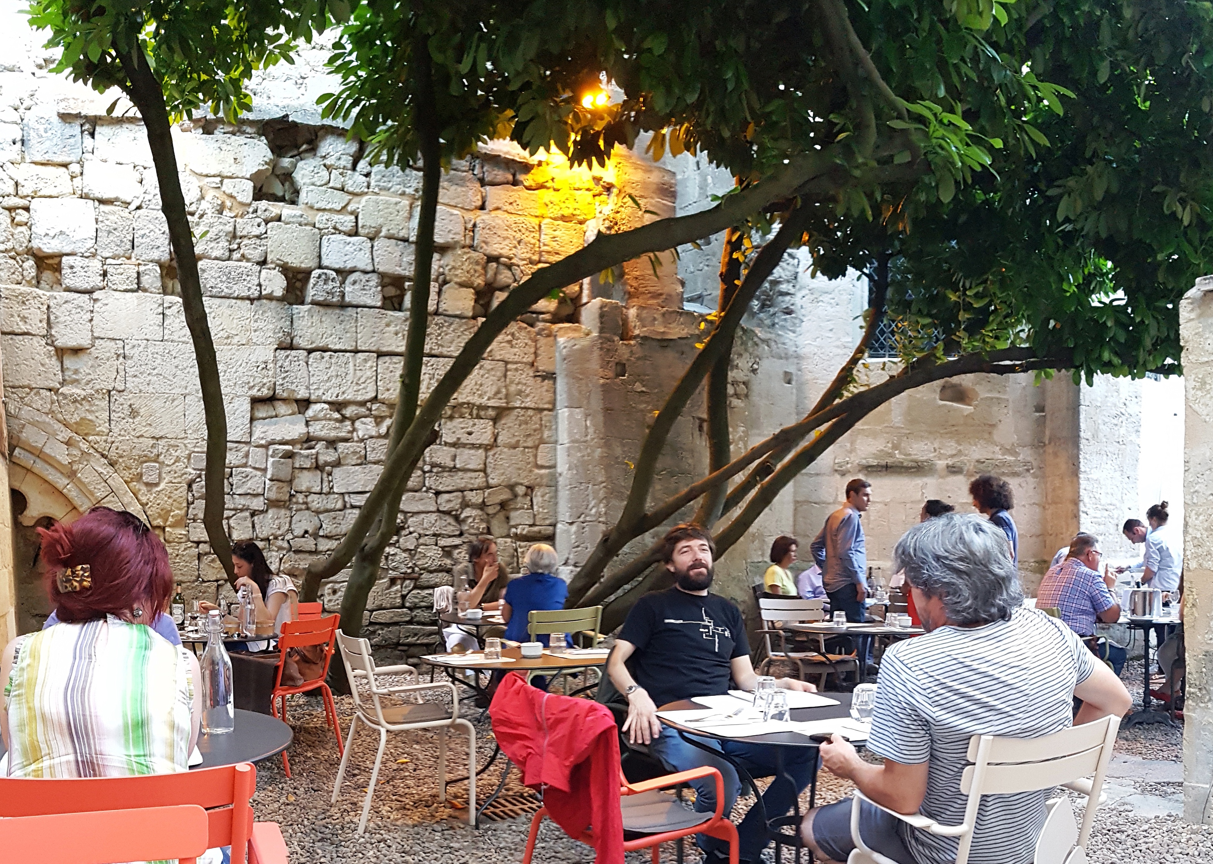Mijn favoriete wijnrestaurant is L’Envers du Décor (terrasfoto), om de hoek bij het Maison du Vin. Met een goede selectie wijnen per glas – zo’n kleine tien wit en rood – en een prachtige wijnkaart is het daar echt genieten. Je kunt even lekker aan de bar hangen. of eten op de binnenplaats. Het eten is niet heel goedkoop, maar goed van kwaliteit. Op de wijnkaart staat een deskundig gekozen selectie van niet alleen Saint-Emilions, maar tevens van veel moois overal vandaan, voor heel redelijke prijzen. Bijvoorbeeld de Champagne Jacquesson Cuvée 739 voor € 80. Een ander leuk adres is RestoVin Chai Pascal, aan de hoofdstraat (Rue Guadet). Wat eenvoudiger van opzet dan L’Envers, met meestal een vijftal rode en twee witte open wijnen, en qua gerechten iets minder avontuurlijk. Denk aan confit de canard, andouillette, dat soort schotels. Gewoon heel aangenaam, want aangenaam gewoon. Wijnbar L’Absolu, in het hart van de stad, is eenvoudig, met een vrij beperkte keuze in open glazen en in flessen. Niet slecht, maar ook niet heel bijzonder. Dit is wel een wijnbar waar flights van drie wijnen kunnen worden besteld.