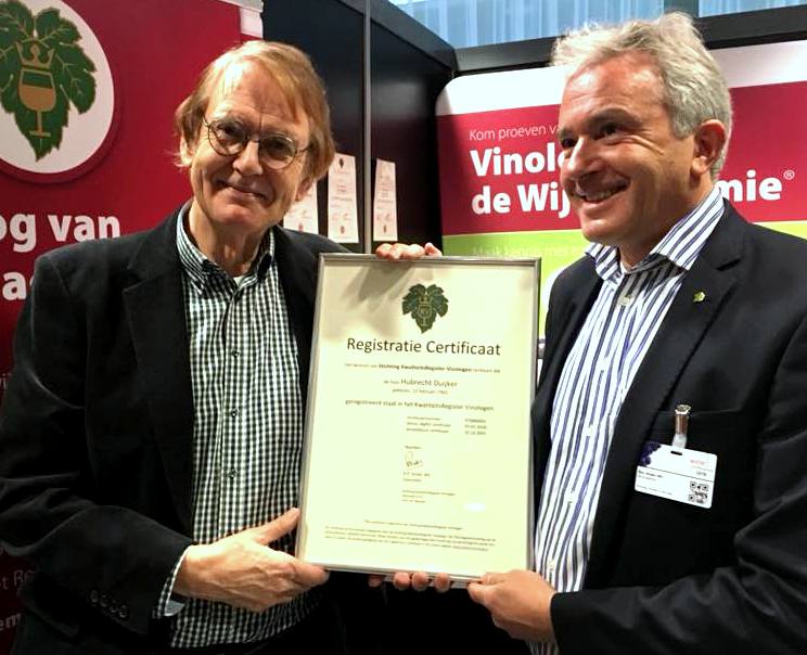 Sinds 1974 hebben zo’n 2500 wijnliefhebbers – de meesten professionals – het examen voor vinoloog met succes afgelegd. Zelf behoorde ik tot de allereerste lichting. Destijds echter was de wijnwereld veel kleiner dan nu. In het eerste cursusboek kwamen Argentinië, Australië, Chili, Nieuw-Zeeland, Zuid-Afrika en heel wat andere landen eigenlijk niet voor. Terwijl bovendien het nodige veranderd is wat wijnbouw en wijnbereiding betreft. De nieuwe stimulans tot zelfeducatie is dus een zeer wezenlijke. Ik schrijf dit mede omdat ik mij – als bedenker van het woord ‘vinoloog’ en schrijver van de eerste cursus – een soort vader voel van de vinologenfamilie. En wat attent, wat aardig, wat eervol, om uit handen van Ron Andes (voorzitter van de Wijnacademie) certificaat nummer één te mogen ontvangen. Naar verluidt heb ik sinds 1974 het nodige gereisd, geproefd en genoteerd om de wijnkennis van toen flink te vergroten. Zie www.wijnacademie.nl.